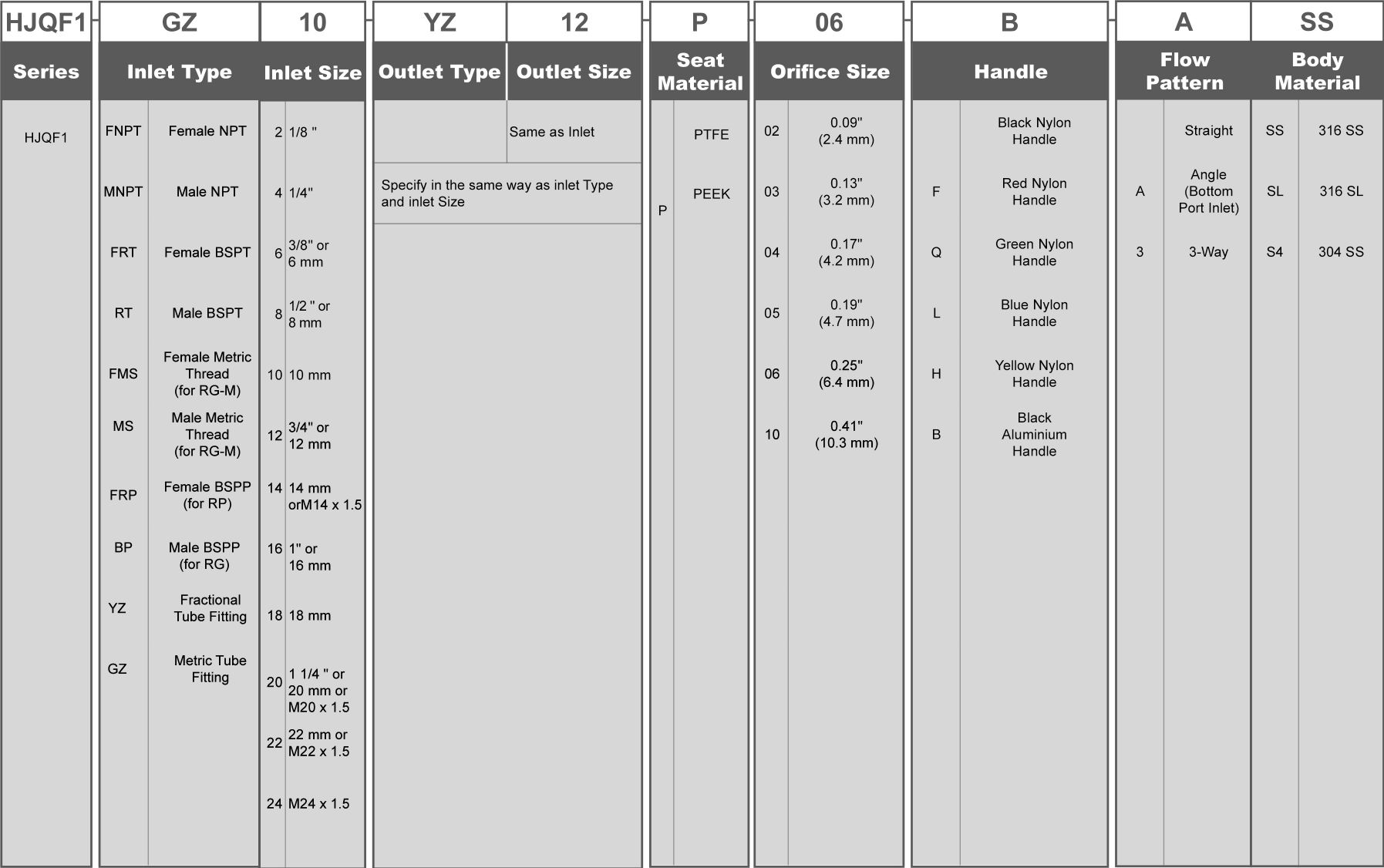 | Orifice, mm | 2.4; 4.2; 4.7; 6.4; 9.5; 10.3 |